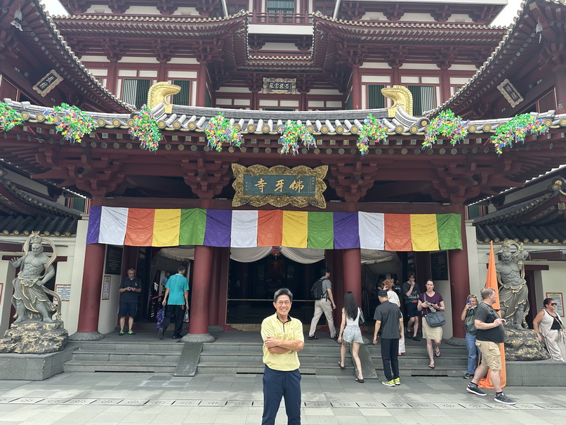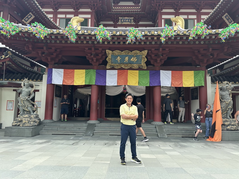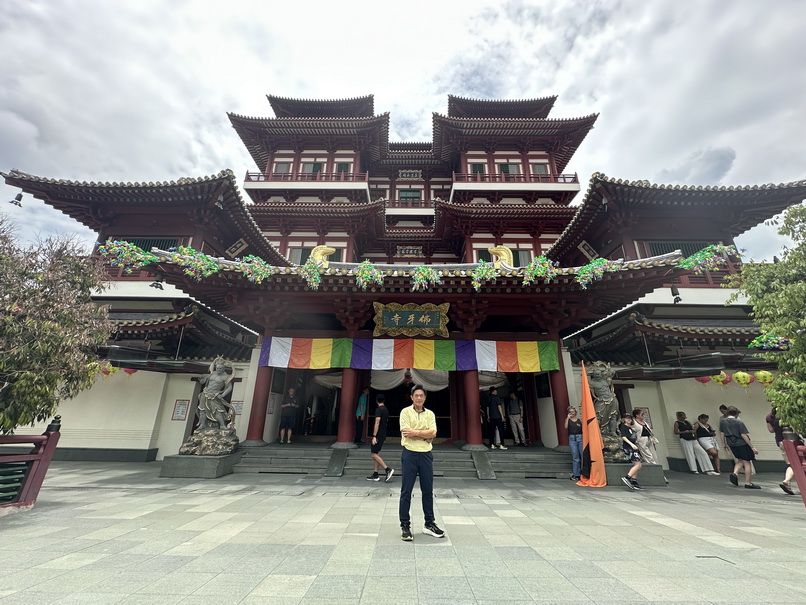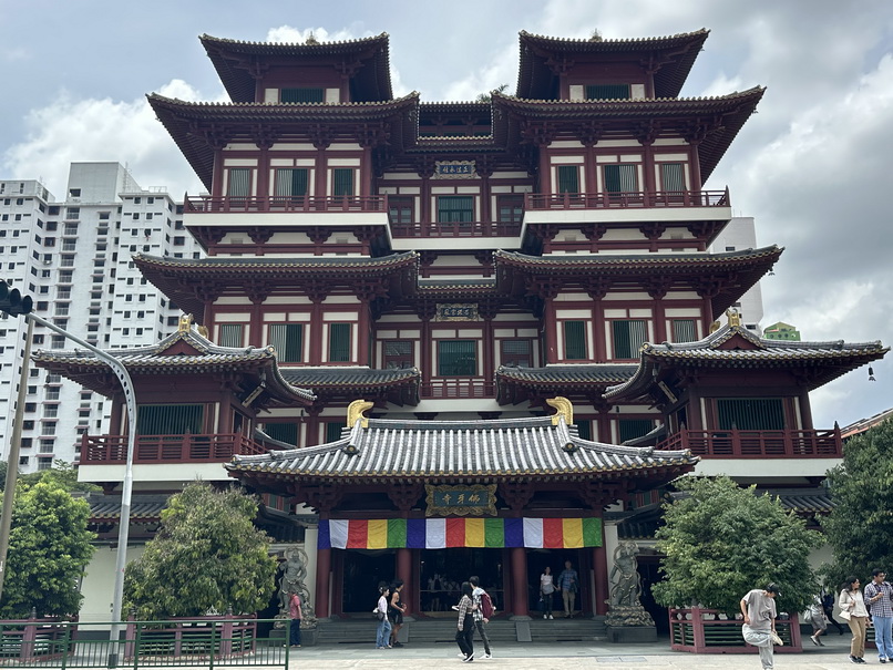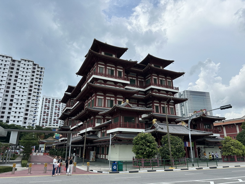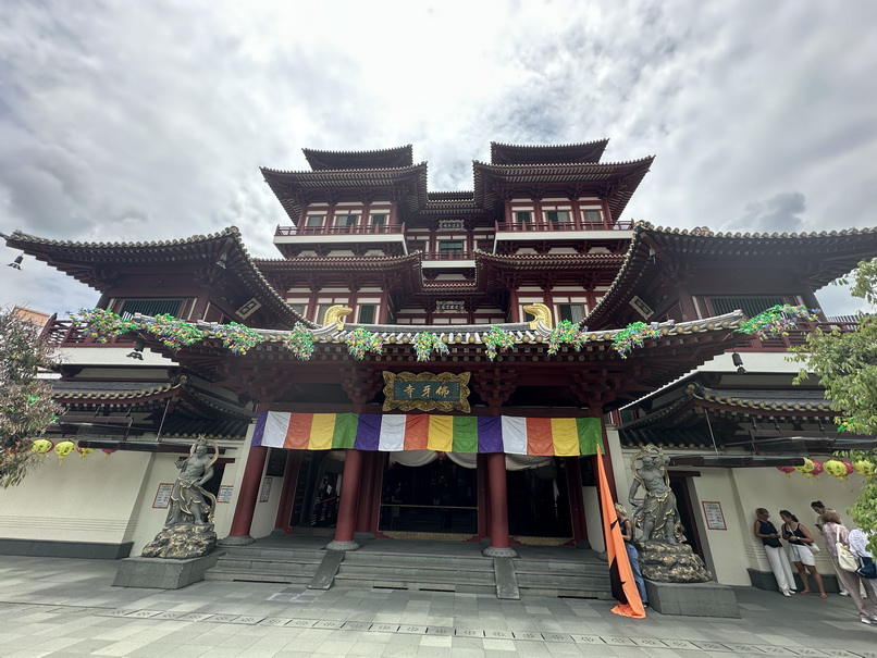 shě gé pà lǎ应邀前来新加坡参观照法师所创办的护国金塔寺,被发照法师对弘扬佛教的贡献深深感动,便决定将珍藏了而是多年的佛牙舍利,交由法照法师监护,并嘱咐法师,如果可以,希望兴建一座寺庙来供养佛牙,让世界各地佛教信徒都有机会瞻礼佛牙。于是法照法师,开始筹建佛牙寺,选择在这里也是由特殊意义的,一是因为旁边的死人街,建在这里可以超度亡灵;二是因为法照法师从小就从牛车水这一带长大的,对这边很有感情。整个佛牙寺的建造格局,是释法照法师闭关一年,亲自设计规划,在海内外的顾问团队的帮助下得以修建的,2005年动土,耗资7500万新元,于2007年落成,并于当时的总统纳丹亲自揭幕。整个建筑可以说是布局巧妙,而且气势恢宏,接下来我们去里面近距离的看一下。